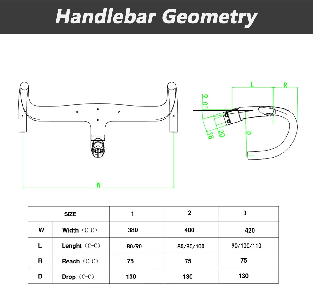 Available sizes of handlebar: 380x80, 380x90, 400x80, 400x90, 400x100, 420x90,420x100, 420x110mm.